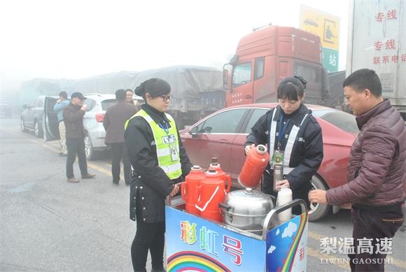 早上7點,鷹潭西收費站的路上能見度不足50米,入口已禁行了近6個小時,收費廣場滯留的車輛逐漸增多。站里的姑娘們推出“彩虹號服務車”,為司乘朋友送去了開水、姜茶和感冒藥等物品。司乘接過暖暖的開水和姜茶,喝完之后捂杯暖手,相互交流,一位來自蘇州的黃姓司乘更是憨實的說到:“等了一晚上,冷的我直咳嗽,喝杯姜茶好多了,你們的服務真溫馨,謝謝啊!”大霧不見散去,姑娘們每半個小時一趟,推著“彩虹號服務車”穿梭于迷霧里、車流中,為滯留司乘提供力所能及的服務和幫助。