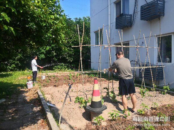 該站在春暖花開的之時,就購買了芋頭、黃瓜、土豆、辣椒、絲瓜等種苗進行播種,在一段時間的悉心照料下,很多種苗已經冒出了新芽,迎來了生長的大好時節。為了讓它們茁壯成長,全體員工都動了起來,有的幫忙松土、有的澆水,有的修剪根芽,有些有經驗的員工則更是用心,拿來了一大捆竹竿搭建架子,生長勢頭迅猛的絲瓜、黃瓜藤順勢而上,一片欣欣向榮的景象。