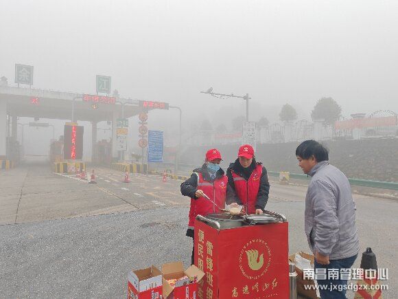 “師傅,我們食堂準備了早餐,有雞蛋面、八寶粥、方便面、餅干,先吃點墊墊肚子,等霧散了再趕路……”1月4日在南昌南管理中心余江收費站外廣場,收費站工作人員正熱情地邀請因大霧滯留現場的司乘用餐。