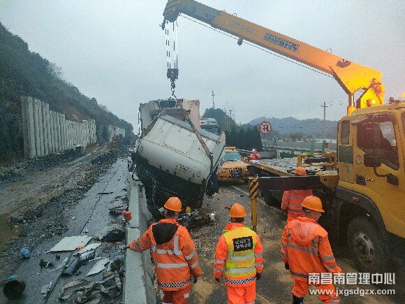 3月5日15時45分,滬昆高速上海方向K502+900公樁處,兩輛大貨車發生追尾事故,其中一輛車撞上中央隔離帶,中央隔離帶碎片散落在南昌方向路面,造成雙向交通中斷,車上有2人受傷,情況緊急。