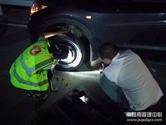 9月1日凌晨2點10分,雙金收費站班長在入口道發卡后發現一輛轎車的輪胎出了問題。他立刻跑出崗亭,喊住車主并提醒:“師傅,您的車胎有故障。”車主下車檢查后發現車子輪胎完全癟了,無法正常行駛,焦急萬分。了解到車主的困境后,收費站工作人員毫不猶豫地迅速行動起來,引導車主將車停在安全區域后,幫助車主找出備胎和工具,蹲在地上和車主一起拆卸故障輪胎,更換備胎。