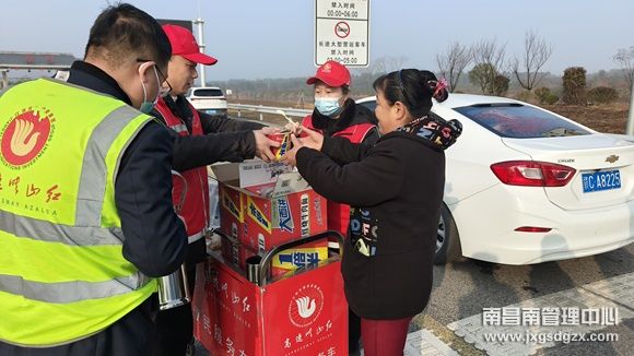2月4日,因大霧天氣影響,高速入口暫時封閉,南昌南管理中心麗村收費站的志愿者們為滯留在收費廣場的車輛提供便民服務。